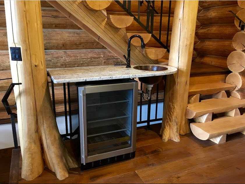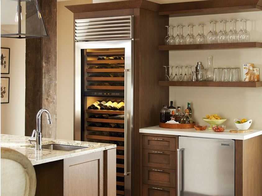Для кухни лучше всего подходит место для хранения напитков в виде шкафчика, встраиваемый в стену. Он повторяет дизайн гарнитура или имеет более оригинальный внешний вид.