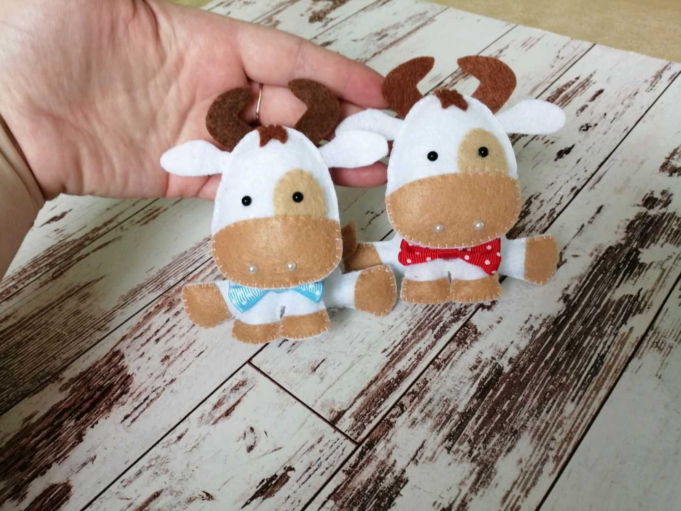 Минимальных навыков шитья для создания новогоднего шедевра будет вполне достаточно. Изначально следует подготовить выкройки. Образцы лекала можно скачать из интернета, а потом вырезать или же нарисовать самостоятельно. Поверьте, юному помощнику обязательно понравится эта идея. Получившиеся шаблоны переносят на фетр и вырезают. Скрепить детали между собой можно при помощи клея или ниток. В первом случае на детали Быка или коровки наносится клей, а сами фрагменты просто накладываются друг на друга. Во втором – соединяются при помощи несложных швов. Для скрепления больших и объёмных деталей используется шов «вперёд иголкой». Для соединения двух фрагментов поделки применяется шов «через край». «Петельный» или «обмёточный» вид шва, идеально подходит для любых изделий из фетра. Дополнительно можно использовать пуговицы, ленты или другой декор, благодаря которому любая поделка будет смотреться наиболее ярко и выразительно.