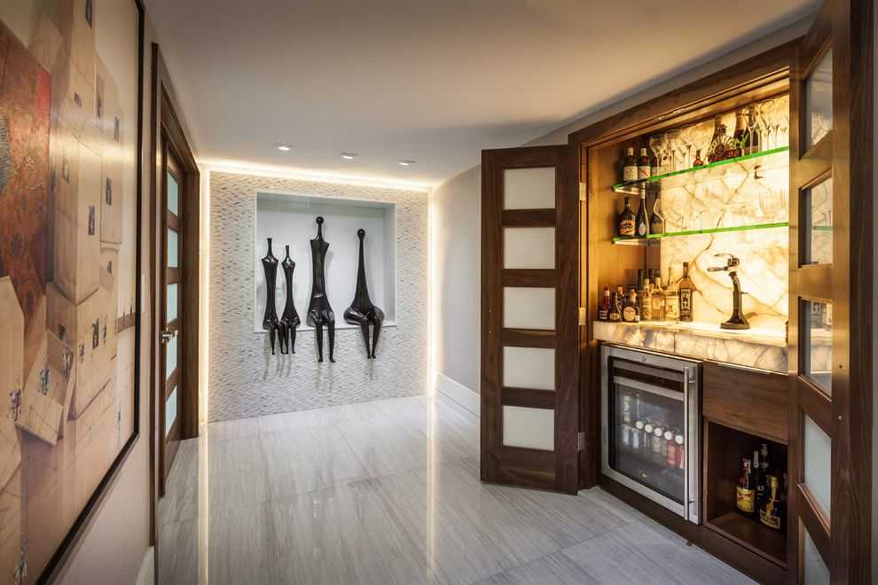 Размещение мини-бара в зале особенно актуально для людей, которые часто зовут в дом гостей и устраивают дружеские встречи. Если интерьер комнаты выполнен в классическом стиле, бар может выглядеть как обычный шкаф для вещей, не нарушая общей концепции дизайна.
