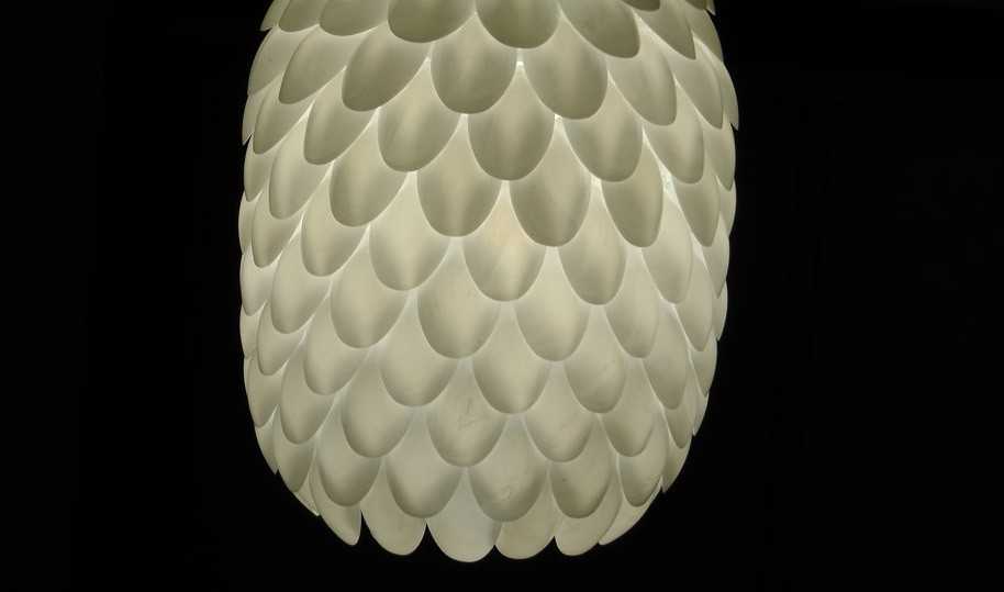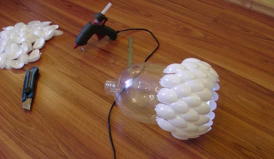 2. С ложек срезаются ручки. С помощью клея выпуклые части приклеиваются к заготовке. Начинать нужно с горлышка. Каждый последующий ряд должен несколько заходить на предыдущий.
