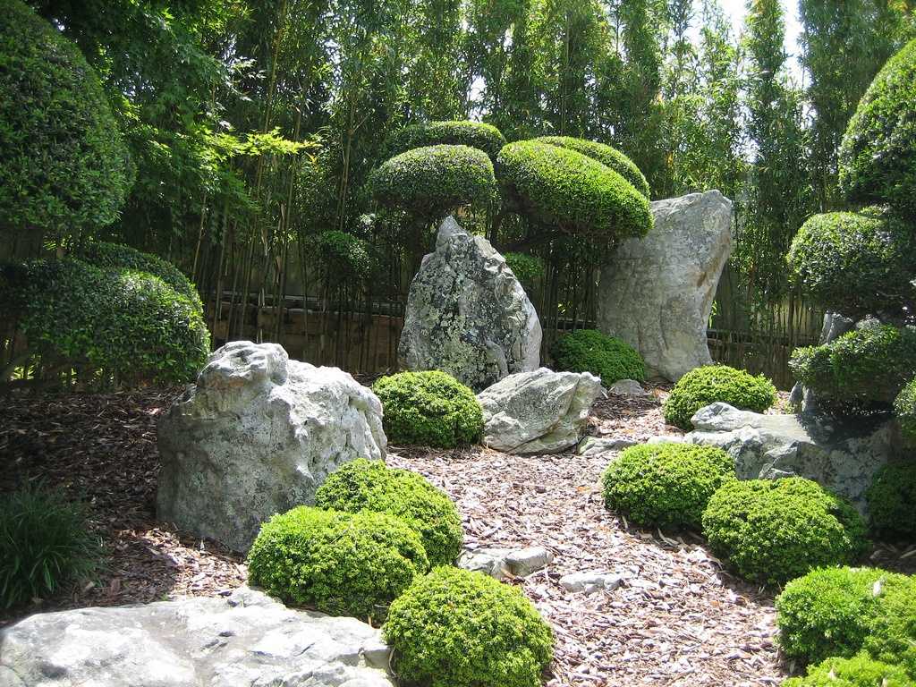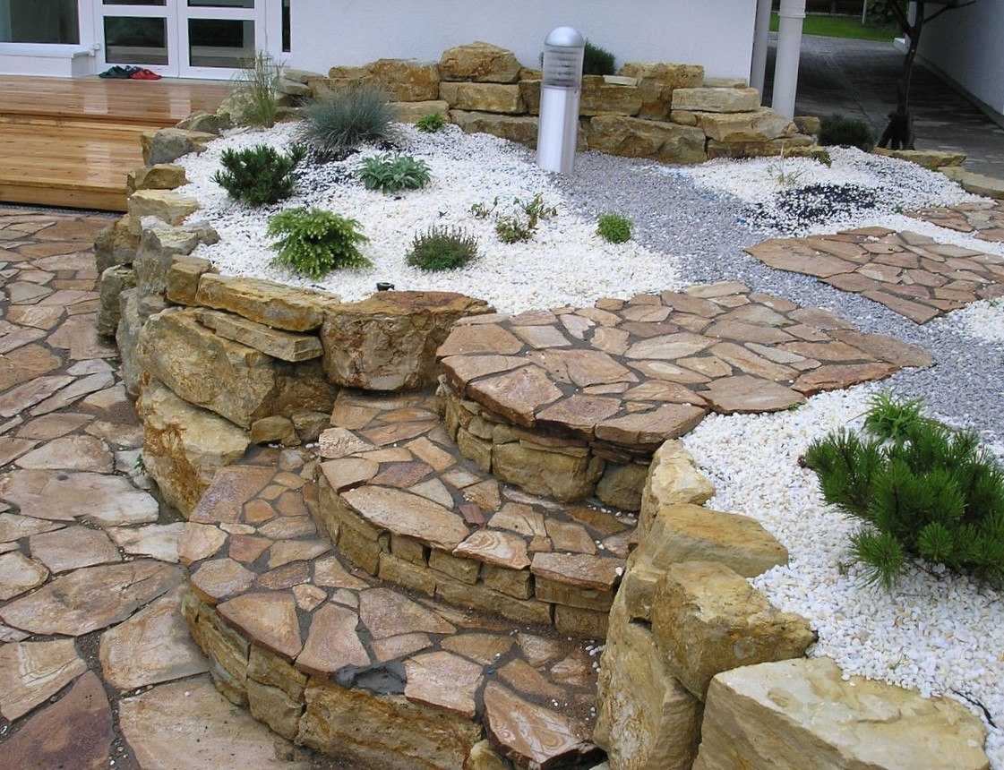 Кроме того, камни используют для создания декоративных подпорных стенок, декорирования садовых лестниц, в качестве оригинальных газонов. Особым изыском считаются скульптуры, собранные из камушков. Обтёсанный камень применяют для облицовки террас и создания целых каменных уголков в саду. Из камня также можно создать великолепный рокарий или выложить красивую альпийскую горку.