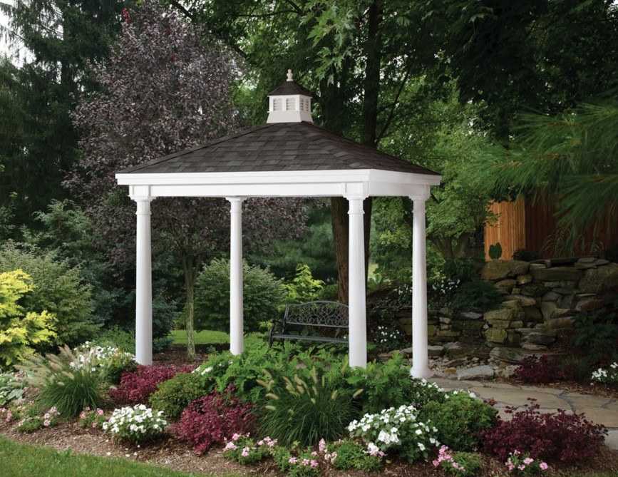 Беседки восьмиугольной формы с прочной кровлей наиболее часто используются в традиционных садово-парковых зонах. Они могут быть привлекательным дополнением, если стиль окружающего ландшафта работает со структурой.