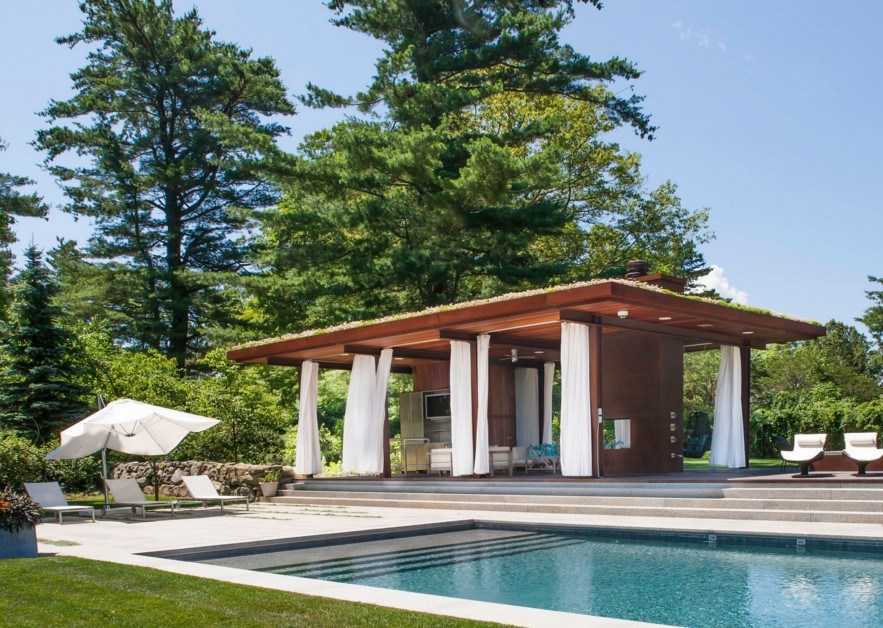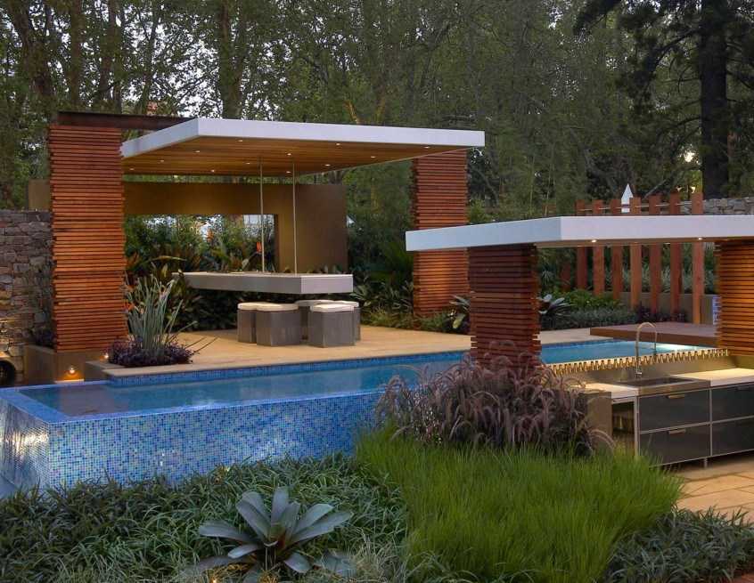 Брезентовый навес – это современный способ получить облегчение от солнца. Ткань растягивается через специально спроектированные столбы для акцентирования и покрытия зоны отдыха или патио. Брезентовый навес отлично смотрится с прямыми линиями и простой геометрией, используемыми в современных домах, и выполняют двойную обязанность – как декоративная и художественная часть пейзажа.