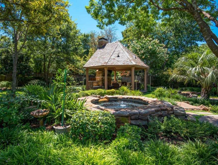 На заднем дворе можно организовать небольшой фонтан и поставить обеденный стол