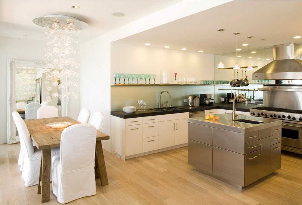 Обеденная зона освещается лампами, дающими теплый свет. При островном размещении стола, их подвешивают к потолку, если же место прилегает к стене, допустимо использовать бра, лампы на прищепках. Любые потолочные лампы рекомендуется оснащать механизмом, позволяющим регулировать их яркость, высоту расположения над столешницей. Здесь оригинально смотрятся световые потолочные балки, а напольные торшеры подойдут лишь для очень просторных комнат. Декоративная подсветка в виде светодиодной ленты «пускается» по: