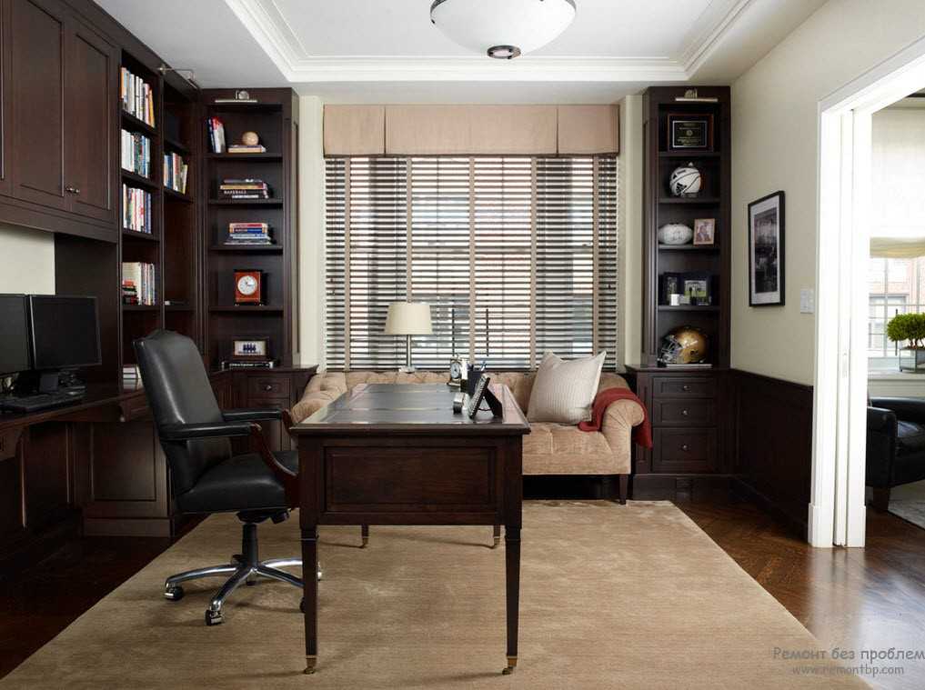 В своем классическом исполнении кабинет представляет собой массивный книжный шкаф, раритетный стол, деревянный стул с кожаными или текстильными вставками и множество антикварных вещей. От чернильницы с гусиным пером до старинного фолианта. В оттенках преобладают темно-вишневые цвета со светлыми тюлевыми гардинами и плотными шторами. Люстра может быть многоуровневой с хрустальными канделябрами с ниспадающим светом на благородных цветов ковер. Такой кабинет подойдет и для решения семейных советов, задушевных бесед и рождения, возможно, гениальных мыслей.