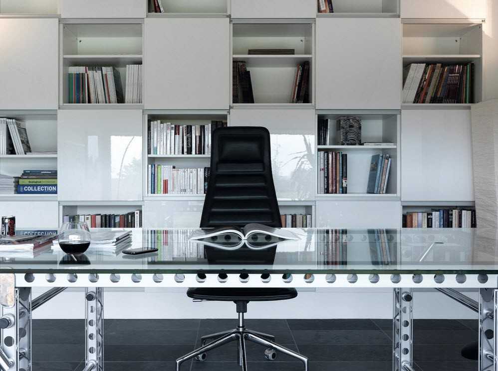 Противостояние классике. Комната оформляется в светлых и белоснежных оттенках. Для отделки используются усовершенствованные материалы (стекло, металл, глянец, пластик). Дизайн кабинета в доме может выглядеть ярче, если поставить диван броского цвета.
