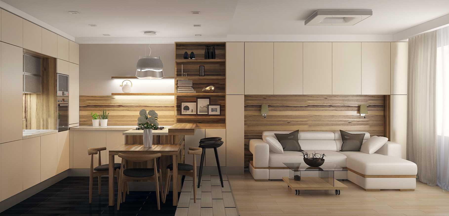 Совмещение места для приготовления пищи с гостиной – популярный вариант в современном жилище. Это просторное помещение, которое позволяет устроить кухню и гостевую зону в одной комнате. Отделить место приготовления пищи от гостевой зоны можно барной стойкой или узким стеллажом. Расставленное таким образом даст возможность зонировать пространство.