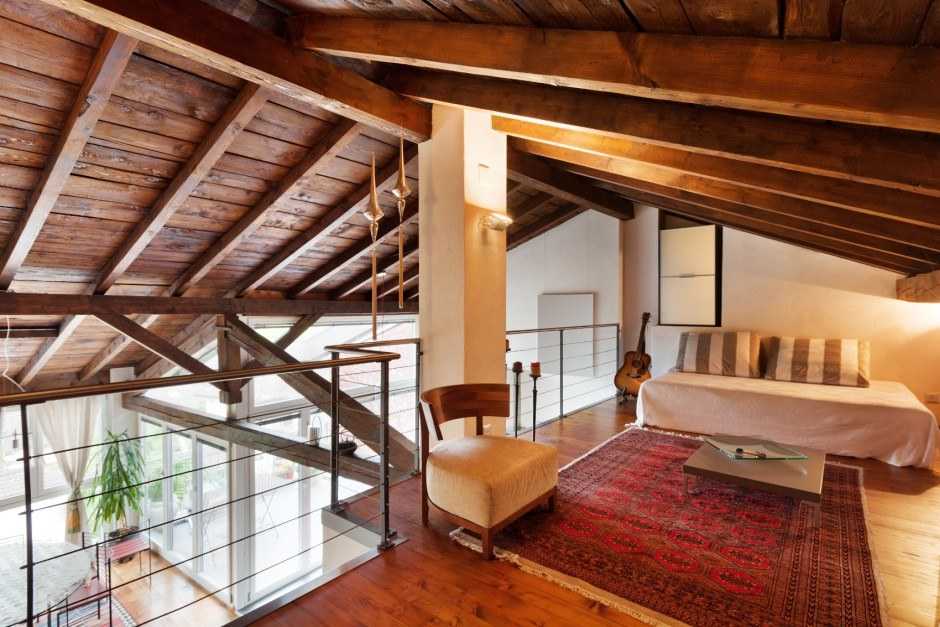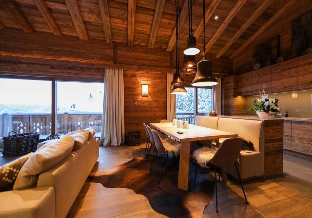 Достаточно часто деревянный интерьер загородного дома имеет естественные элементы скелета постройки, как, например, столбы, поддерживающие балки или другие детали потолка. Правильно интегрированные и адаптированные к стилю интерьера, они могут добавить шарм в современное оформление, дополнительно организуя пространство.