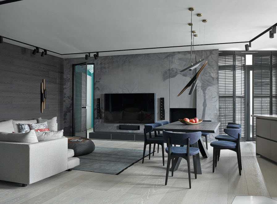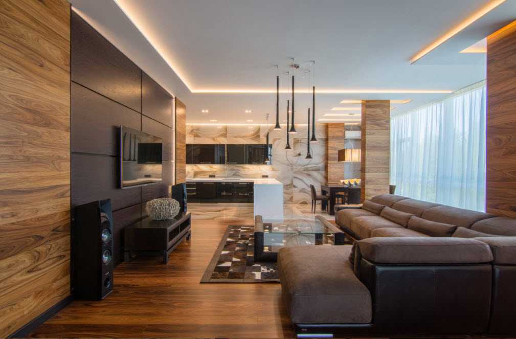 В частных домах одну из стен зала можно расчистить до основания. Кирпичная кладка станет прекрасной поддержкой стилю лофт. Оригинальным отделочным решением является природный или искусственный камень.