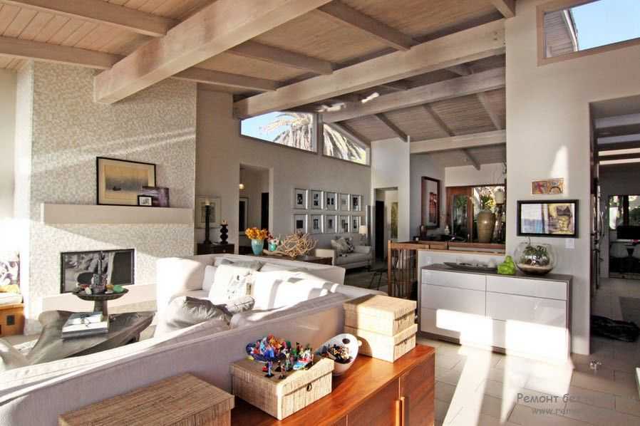Потолок в данной гостиной декорированный деревом, а роль верхнего освещения выполняют стилизированные фонари