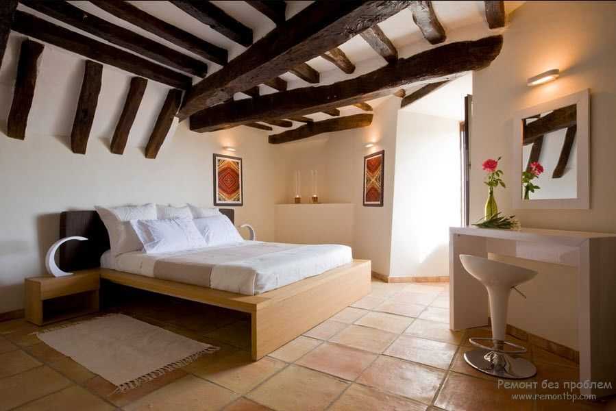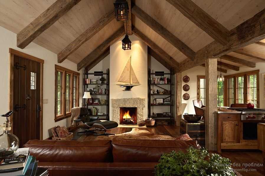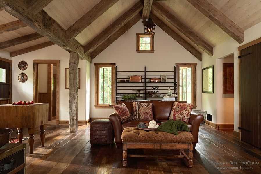 Кантри или деревенский стиль. В этом стиле совмещаются простота и традиции. Деревянное покрытие потолка отлично сочетается с простыми оштукатуренными стенами, в которых иногда делают кирпичные или каменные вставки.