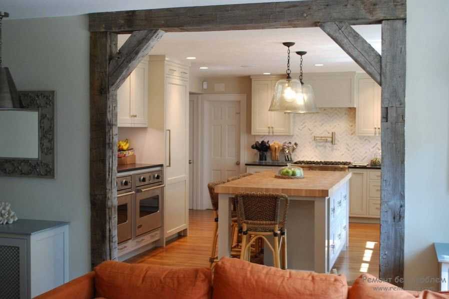 - Если балка находится на кухне, то можно использовать её в качестве вешалки для кухонной посуды, закрепив на ней рейлинг. Кроме того, вниз можно установить барную стойку, и получится островок на кухне. Такой способ часто можно заметить в зарубежных фильмах.