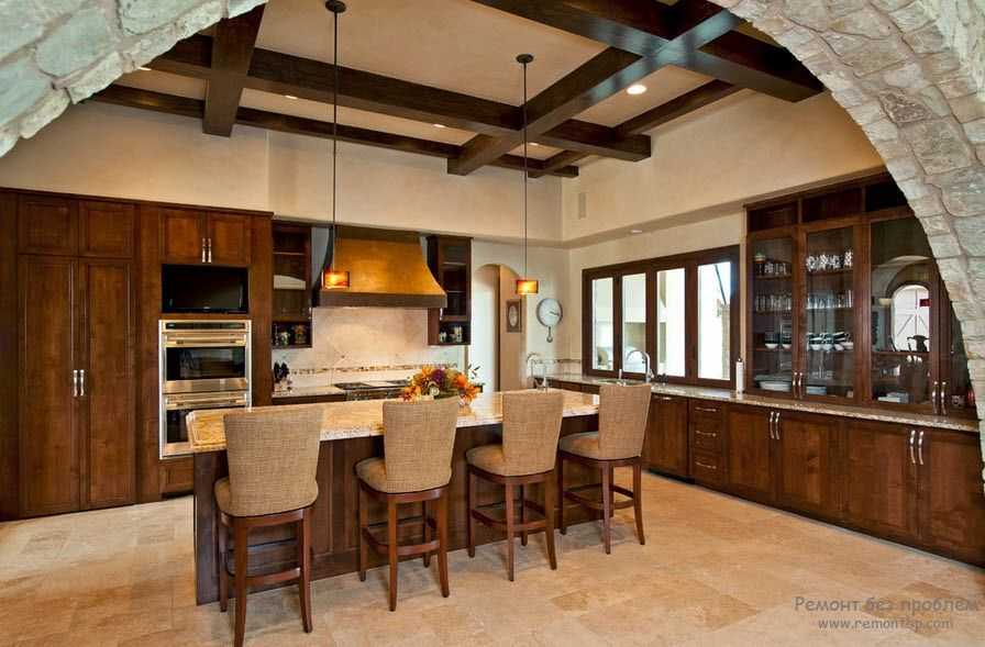 Для помещения, выполненного в стиле кантри, будет уместен гладкий или неровный деревянный потолок, балки и колонны. Дерево можно интенсивно тонировать, а само оформление помещения может быть нарочито грубым и максимально естественным.