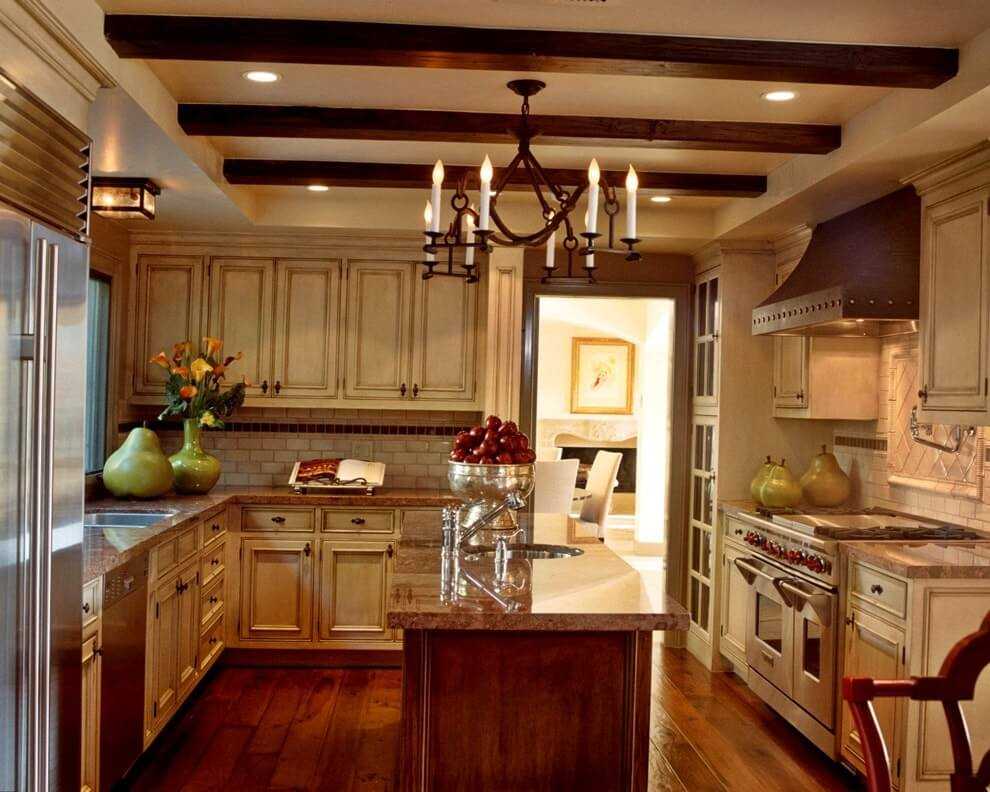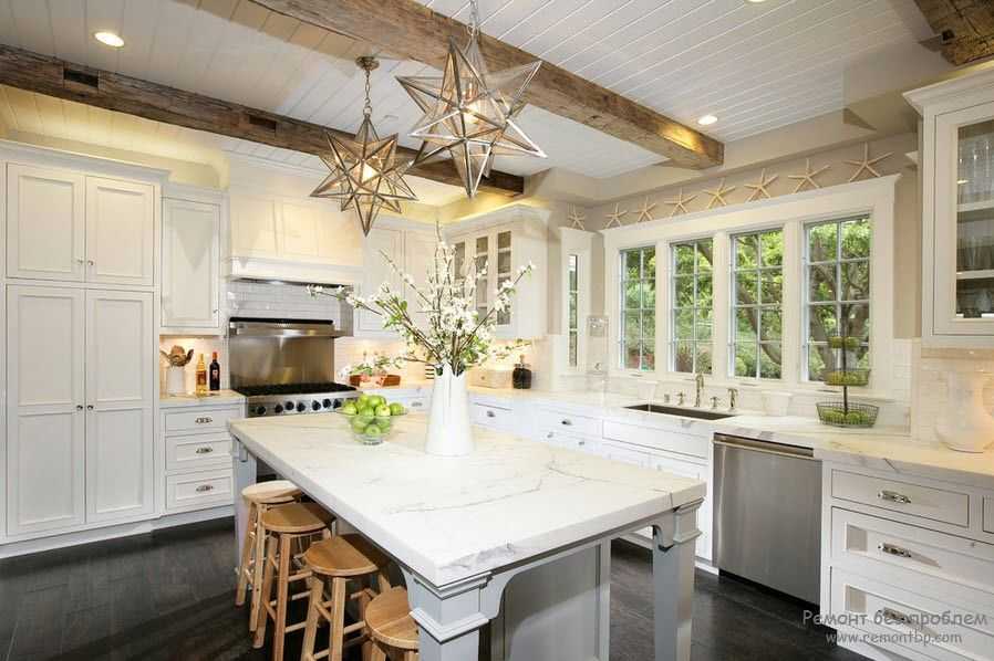 - Прованс. Мягкость светлых оттенков будет кстати, поэтому фальшбалки часто выполняются из осветленной древесины, закрашиваются и забеливаются в кремовых, голубых тонах. Идеально смотрится кухня, где на балочные элементы подвешиваются гирлянды из цветов, связок лука, чеснока, букетики специй.