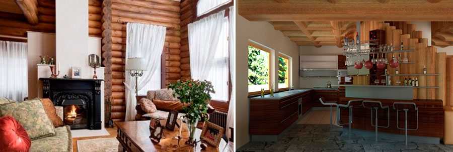 Для бревенчатого дома нехарактерно использование обоев. Большинство проектов основаны на том, что тон задает основа из ровных рубленных бревен. Стены чаще всего даже не красят, только изредка декорируют. Красиво в интерьере дома из бревна смотрятся украшения с джутом или картины в массивных деревянных рамах. Внутренний интерьер домов из бруса или из бревна от этого наполняется уютом и выглядит более естественно.