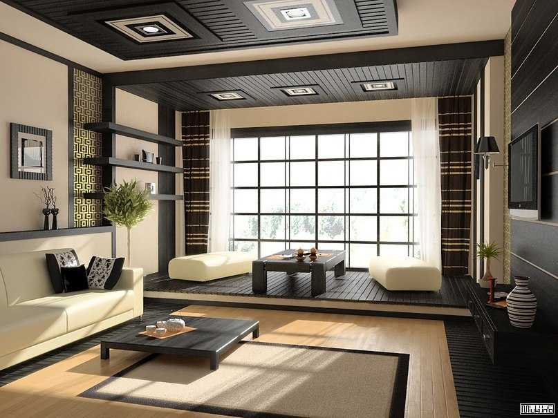 Внутреннее оформление японских домов сдержанное и строгое, поэтому здесь есть общие черты с минимализмом. Мебели и декора здесь практически нет, стены украшают рисунками и гравюрами, шелком с ручной росписью. Японский интерьер требует обилие свободного пространства и света, поэтому окна закрывают лишь легкие занавески или полупрозрачные шторы. Для оформления потолка принято использовать деревянные балки, в качестве напольного покрытия – твердая древесина (кедр, дуб или бамбук), отполированная до блеска. Разделить пространство на функциональные зоны можно при помощи тканевых и бумажных ширм.