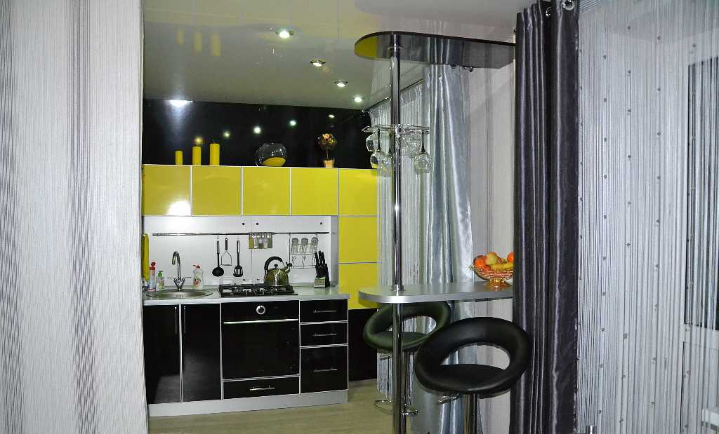 Особого внимания заслуживают стены. Для маленькой площади опасно выбирать обои с крупным черным рисунком, иначе кухня из воплощения строгих линий и четких контуров превратится в беспорядочные пятна. Пусть покрытие стен будет однотонным или с мелким абстрактным узором.