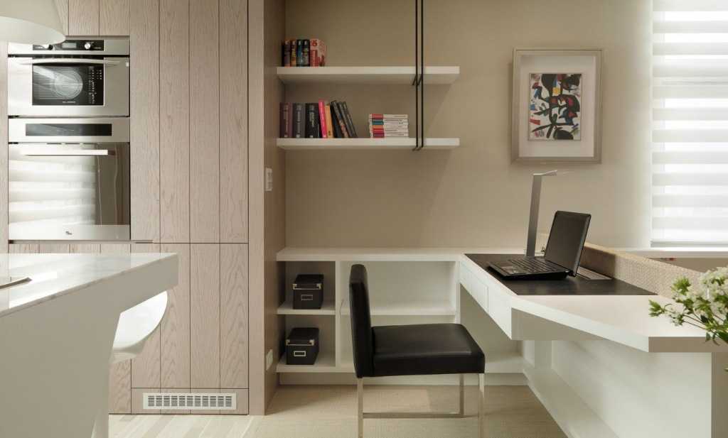 Лишняя площадь в квартире – непозволительная роскошь, поэтому чаще всего оборудуется миниатюрный рабочий уголок в гостиной комнате, который ограничивается угловым компьютерным столом, офисным креслом и несколькими книжными полками. Также возможен вариант раскладывающегося стола, а все рабочие аксессуары можно хранить в серванте или на подвесной полке. Сэкономить пространство поможет замена стационарного компьютера на ноутбук или планшет, а ксерокс, принтер и сканер можно заменить МФУ. Если не планируются ближайшие перестановки в комнате, рабочий угол визуально можно отделать декоративной штукатуркой, тонкостенным кирпичом или задекорировать фотообоями на самоклейке.