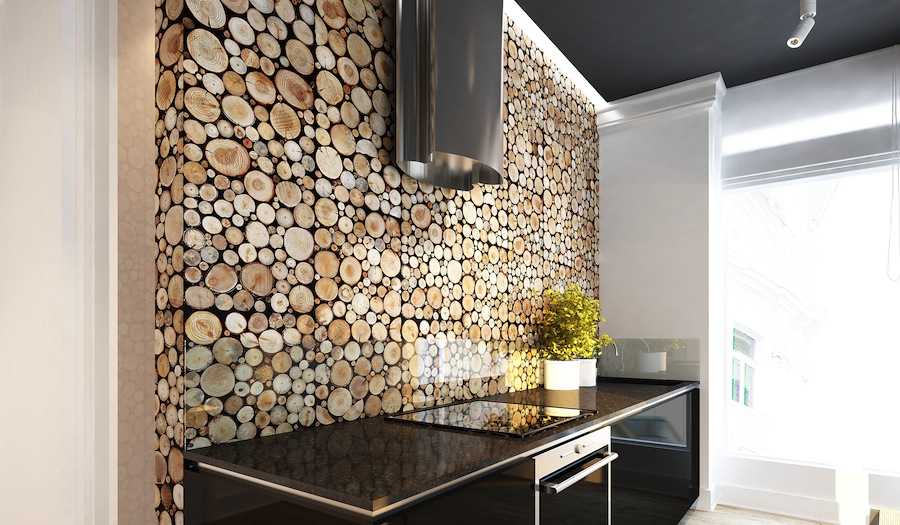 Интересным и непривычным будет отделка деревом кухонного фартука. Чтобы дерево меньше подвергалась негативному воздействию влаги, загрязнений и высоки температур, его можно закрыть прозрачным стеклянным листом – скинали.