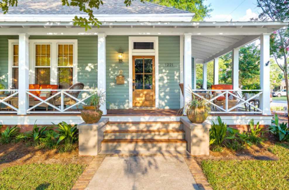 Деревянный сайдинг в оформлении террасы контрастирует с глиняными горшками с геранью. Плетеная мебель, фарфоровые и металлические детали завершают дизайн одноэтажного дома с террасой