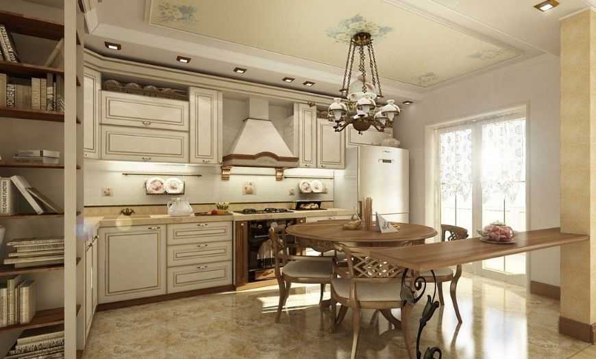 Просторную комнату наполнят романтикой многослойные композиции. Однако, слишком тяжёлые и объёмные драпировки здесь неуместны. Мотив штор обязательно дублируется в остальных текстильных элементах: отделке мебели, на скатертях, на многочисленных полотенцах, салфетках и прихватках. Декоративная отделка, как правило, простая. Это могут быть рюши, банты, оборки и подвязки.