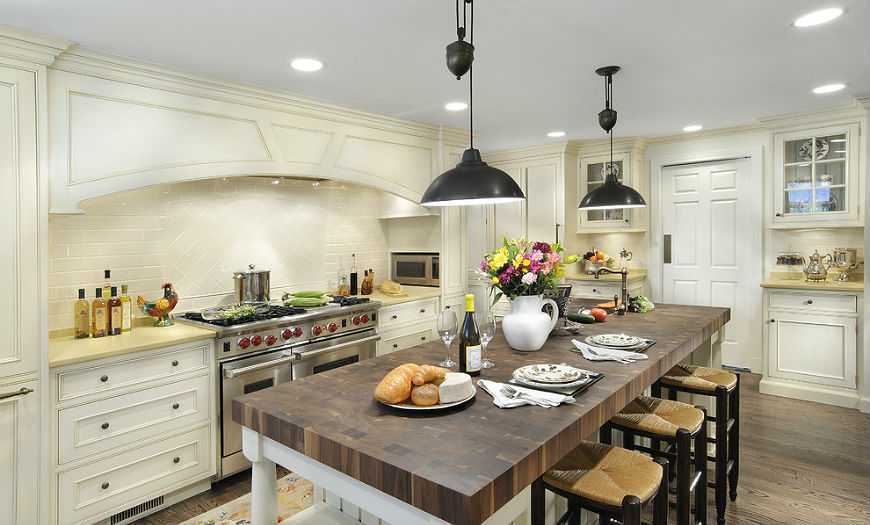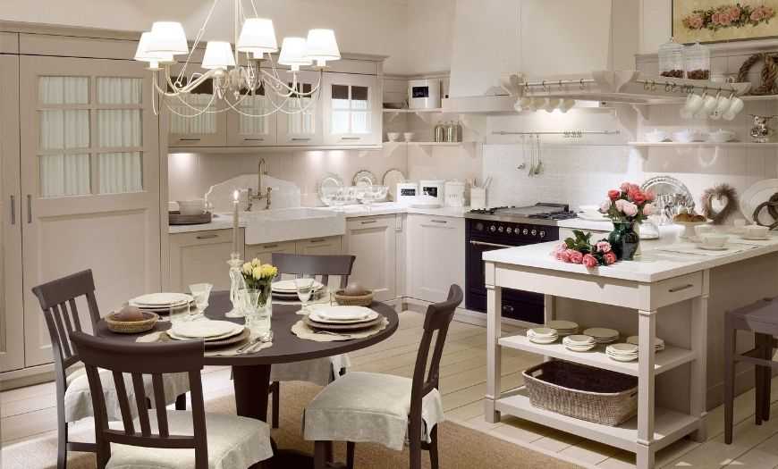 Можно выбирать тот или другой вариант, но гарнитур должен соответствовать размерам помещения. Для прованского стиля на кухне типично наличие отдельной зоны, в которой имеется шкафчик-хранилище и рабочий стол для разделки продуктов. Здесь хозяйка может без помех возиться с тестом. Но если площадь кухни маленькая, от такого «островка» придется отказаться, поскольку уменьшение пространства кухни будет создавать большие неудобства.