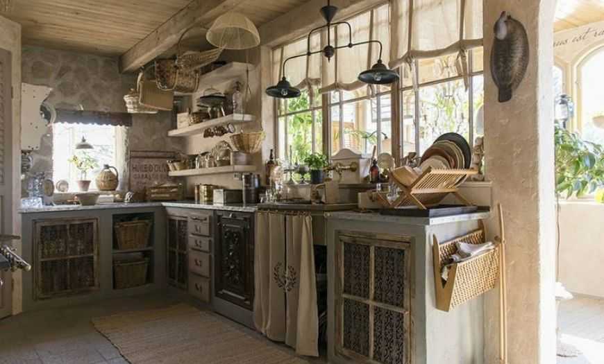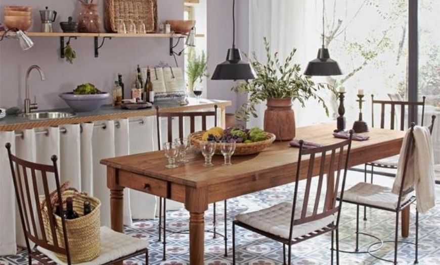 Чтобы мебель была максимально приближена к провинциальной деревенской, ее зачастую искусственно состаривают. Ни о какой полировке не может быть и речи. Если приобретение гарнитура из натурального массива владельцу жилья не «по карману», можно купить имитацию с МДФ отделкой. Шкафы и тумбы должны быть массивными и вмещать в себя много посуды.