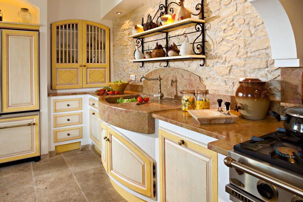 Столешница в прованском стиле олицетворяет собой основательную каменную или деревянную поверхность. Материал для мойки – керамика, натуральный или искусственный камень. Смеситель – медный или бронзовый.