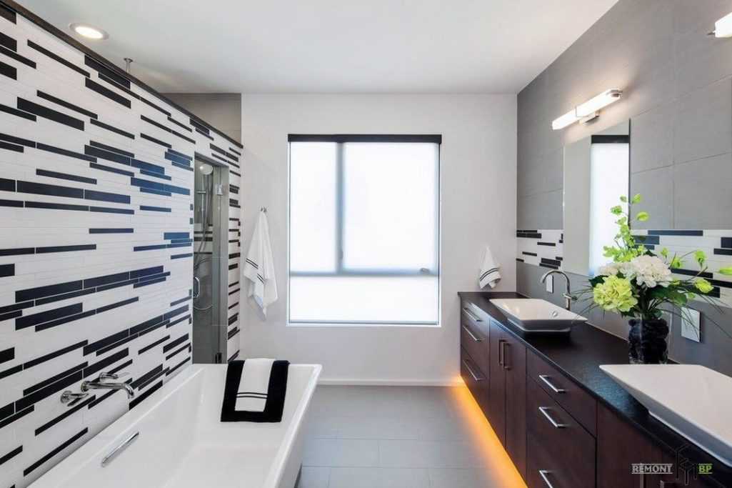Оформив одну из стен черно-белой плиткой в хаотичном расположении, можно не только привнести контраст в обстановку ванной комнаты, но и придать помещению индивидуальный характер.