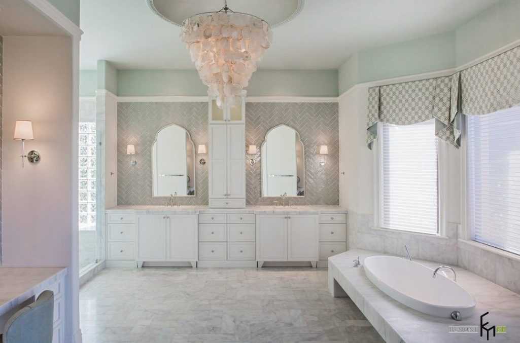 Глянцевая керамическая плитка в елочку идеально подходила для укладки плитки на поверхности вокруг зеркал и идеально вписывалась в общую светлую обстановку просторной ванной комнаты с эркером и овальной ванной внутри.