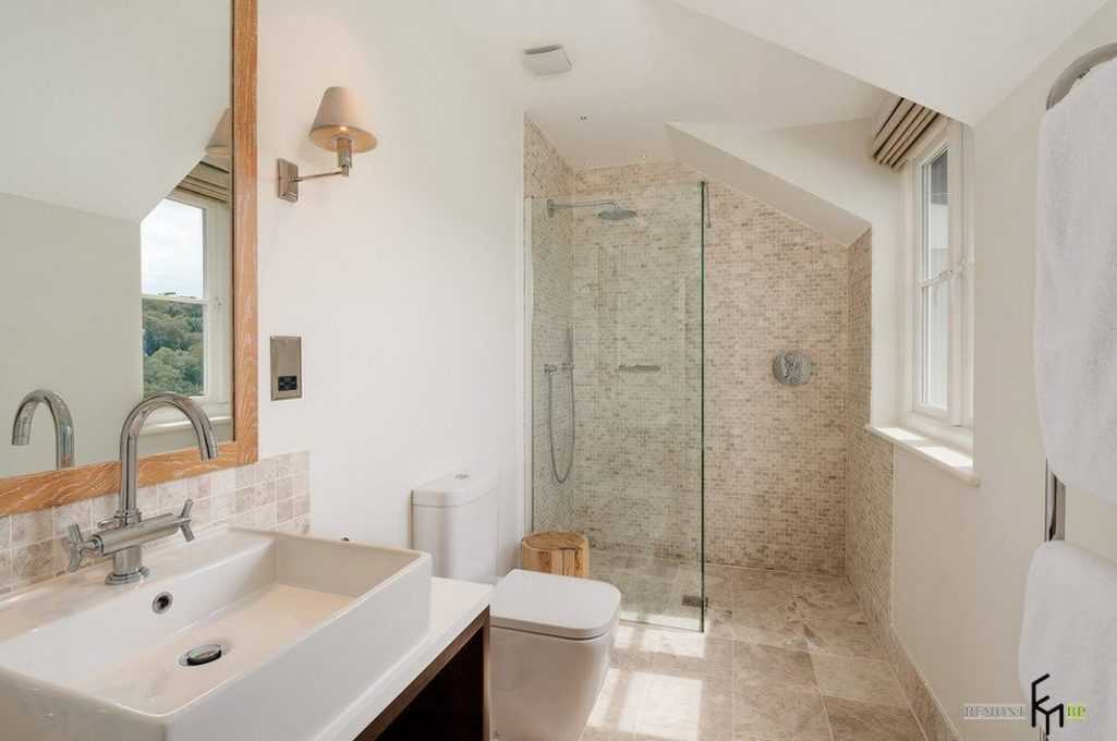 В этом случае мозаичная плитка украсила стену душевой кабины. Контрастный, но естественный оттенок плитки выгодно выделяется на фоне белоснежной отделки этой просторной ванной комнаты, расположенной на чердаке.