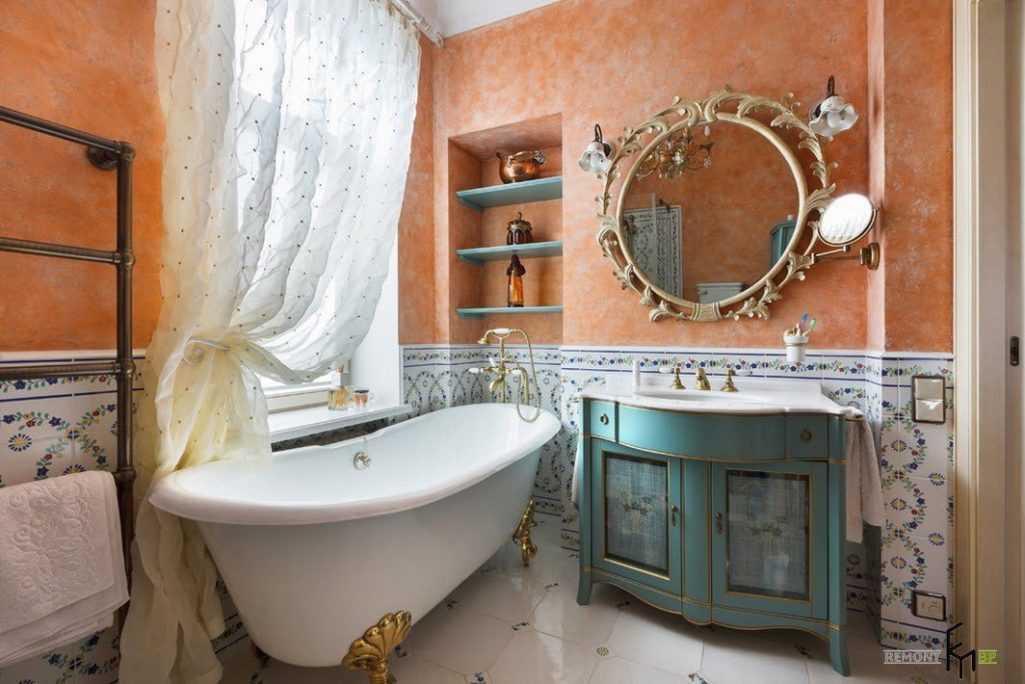 В ванной комнате все заслуживает особого внимания: сама ванна на позолоченных ножках и соответствующие аксессуары, зеркало в резной раме, старинный комод в приглушенно-лазурном цвете и необычная отделка стен в красноватом оттенке. Но самой оригинальной деталью интерьера является рисунок на керамической плитке, которым украшают рабочую часть стен.