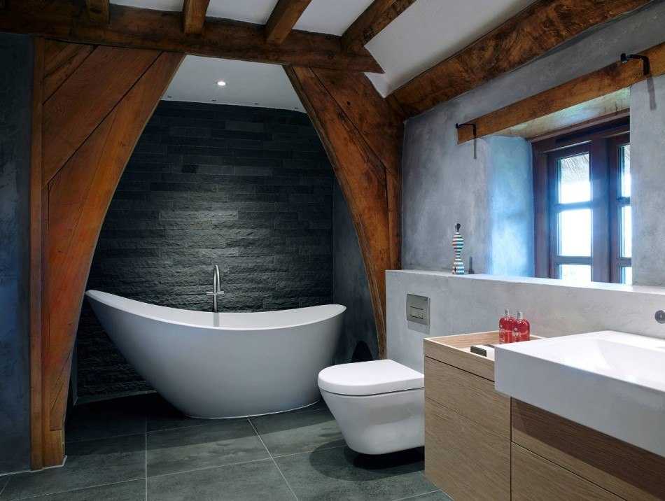 Сама ванная может быть как в ретро стиле, на ножках сделанных в виде лап животного, так и обычная, но во втором варианте лучше отказаться от пластикового щита, сделав вместо него облицовку из плитки.