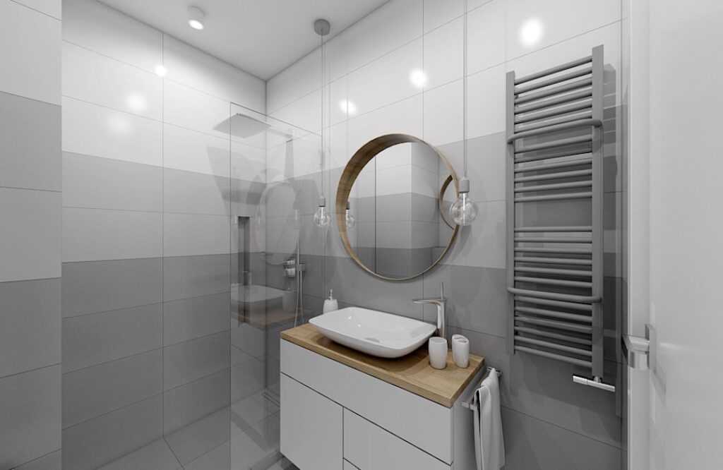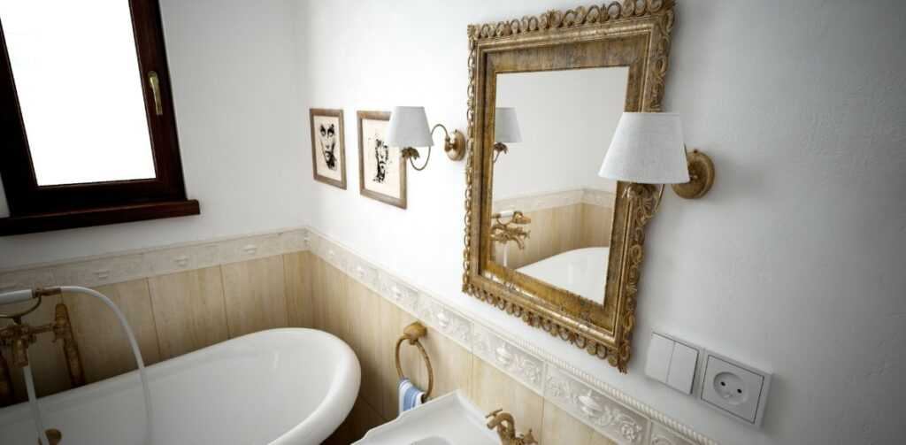 6. Позаботьтесь о прозрачности и хорошем освещении ванной комнаты — используйте лампу для ванной комнаты без тени и выберите большое зеркало с узкой рамой.