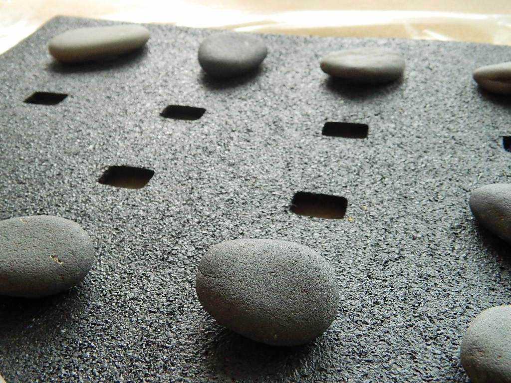 На рабочую поверхность кладем старую шторку, чтобы защитить ее от воздействия герметика. Размещаем самые большие камни поверх отверстий на коврике.