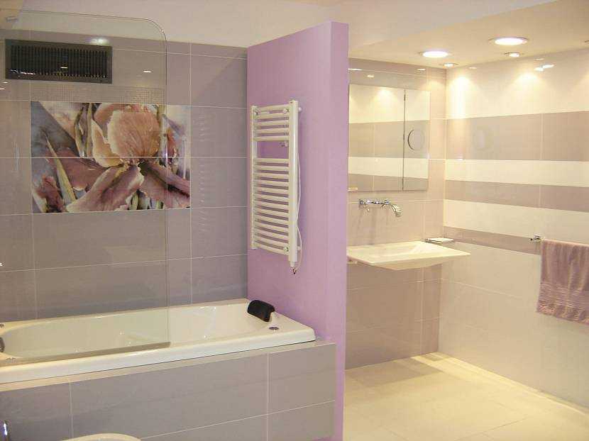 Интересным вариантом является взаимодействие в одном помещении сиреневой плитки разных тонов, с помощью которых становится возможным легко поделить пространство ванной комнаты на зоны. Для этой цели достаточно двух оттенков одного цветового колера.