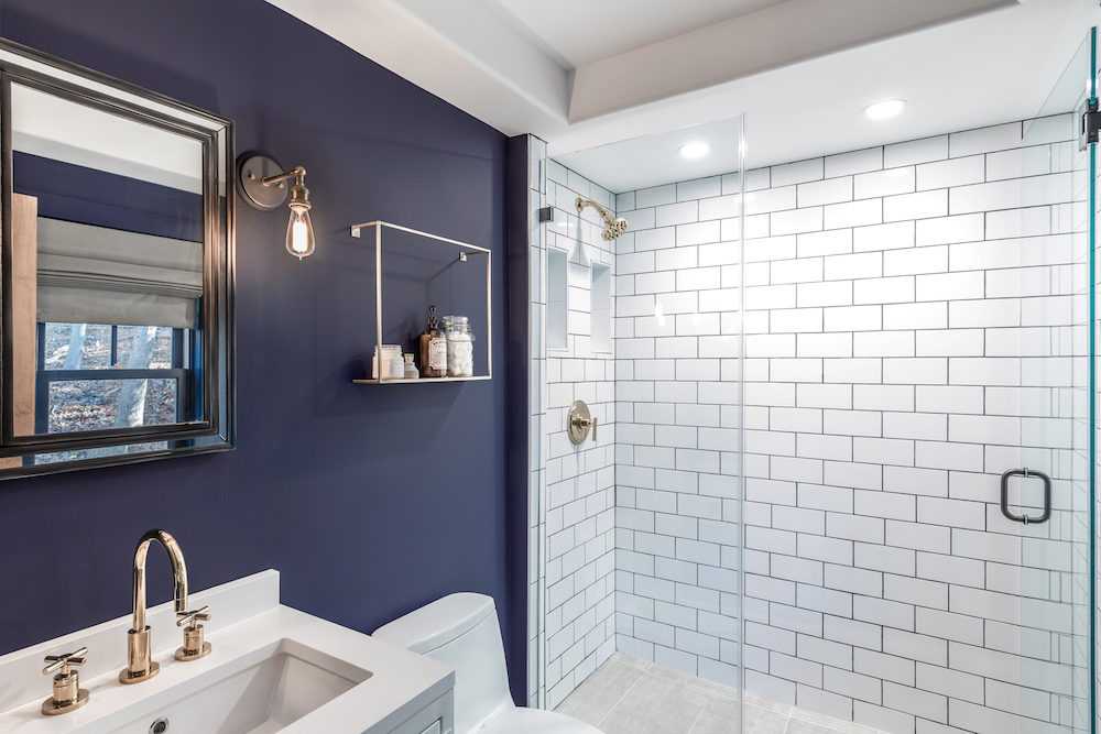 Очень необычно и стильно смотрится темный колер индиго в стиле хай-тек. На таком насыщенном фоне резко выделяются хромированные аксессуары и лаконичные формы белоснежной сантехники. Завершит образ пол и пара акцентов на стене сиренево-серого цвета. Можно самостоятельно придумать и выполнить геометрический орнамент, контрастный к основному покрытию тона. В оформлении интерьера уместно использовать резкие полярные сочетания оттенков, например, светлое обрамление темной стены.