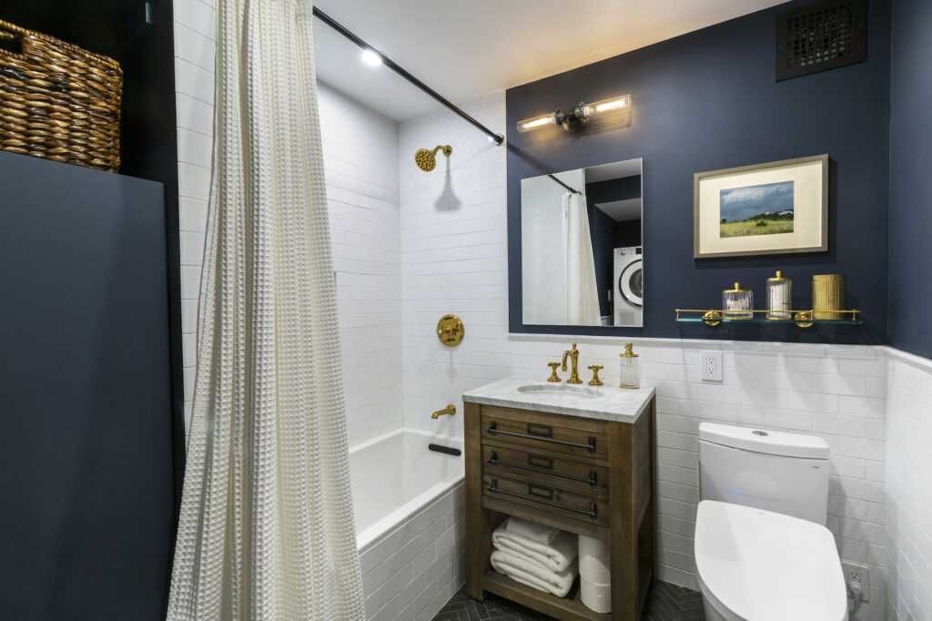 Выцветшая синяя керамическая плитка и стилизованная сантехника и смесители отлично подойдут в этой эстетике. Есть также керамическая плитка и другие виды напольной плитки, которые выглядят так, будто использовались годами. Они дороже стандартных, но отлично впишутся в ванную комнату в этом стиле.