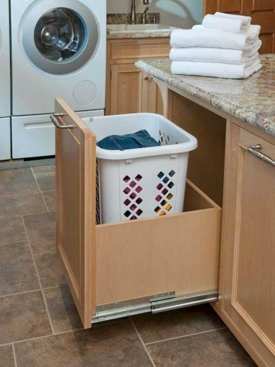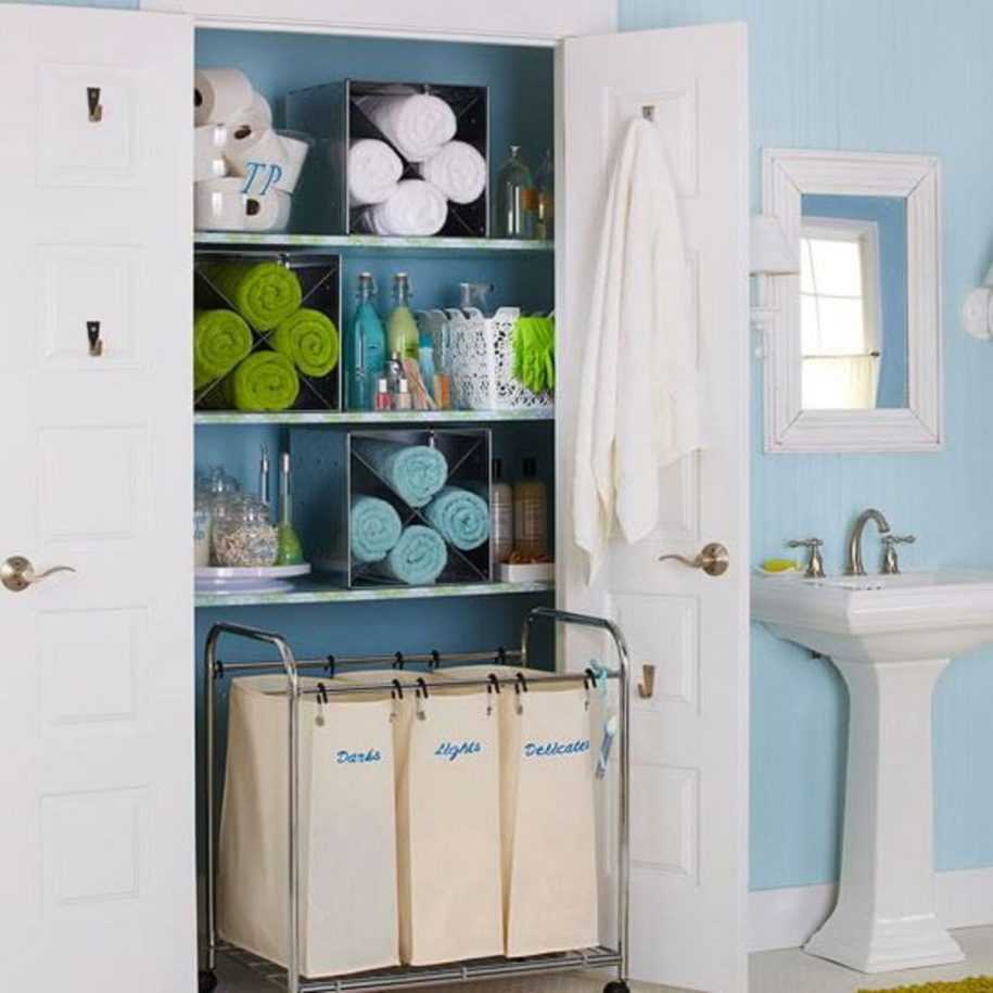 - Пылесос, ведра располагают в нижней части шкафа, тазики и корзины можно разместить на самом верху – в антресолях.