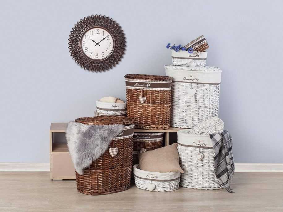 ротанга, соломы, лозы, бамбука –ящики в ванную комнату из этих материалов отличаются лёгкостью и изяществом. Разные оттенки и формы изделий подойдут для любого интерьера. Переплетения прутьев оставляют естественные зазоры и послужат в качестве естественной вентиляции.
