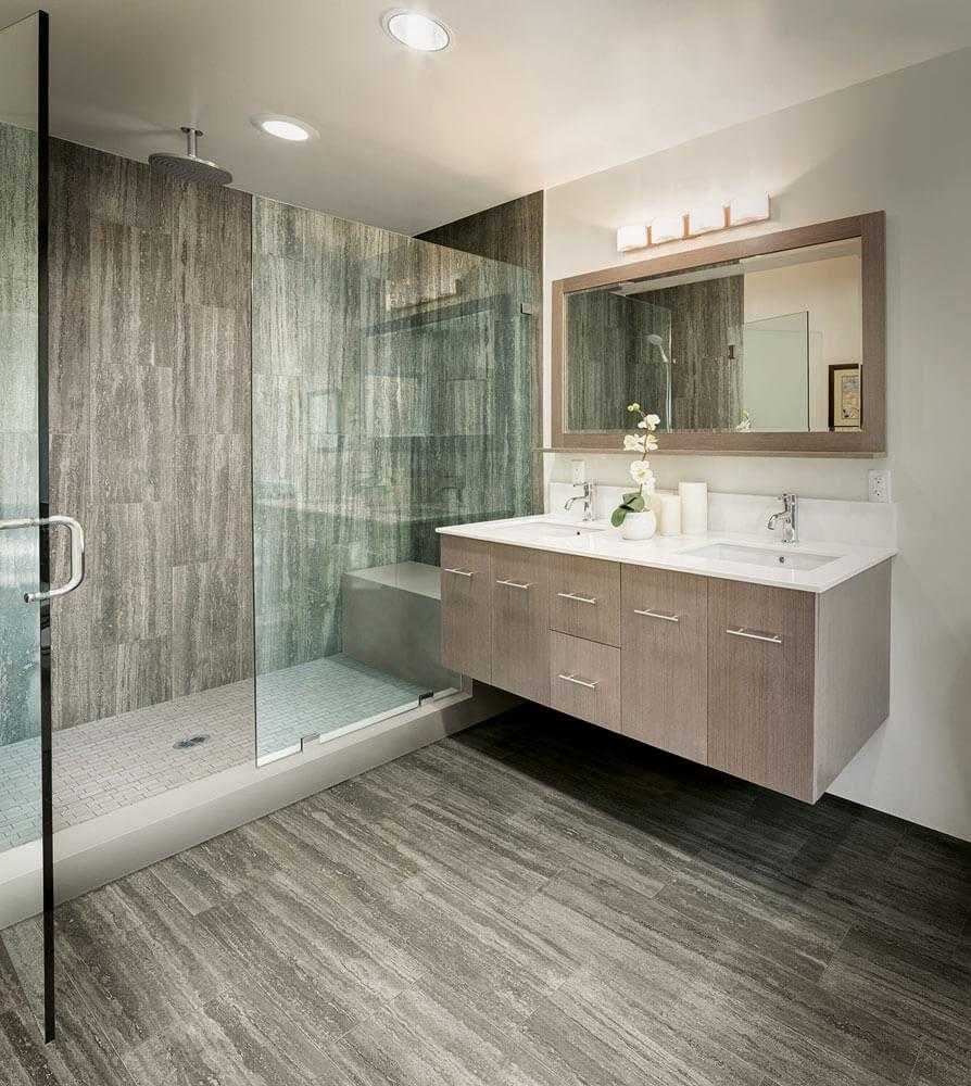 Хотя на рынке есть панели из экзотического дерева, которые идеально подходят для помещений с повышенной влажностью, таких как кухня или ванная, керамическая плитка все же более удобна в повседневном уходе в таких помещениях, особенно в ванной. Керамогранит под дерево — отличное решение для оригинальной современной ванной комнаты.