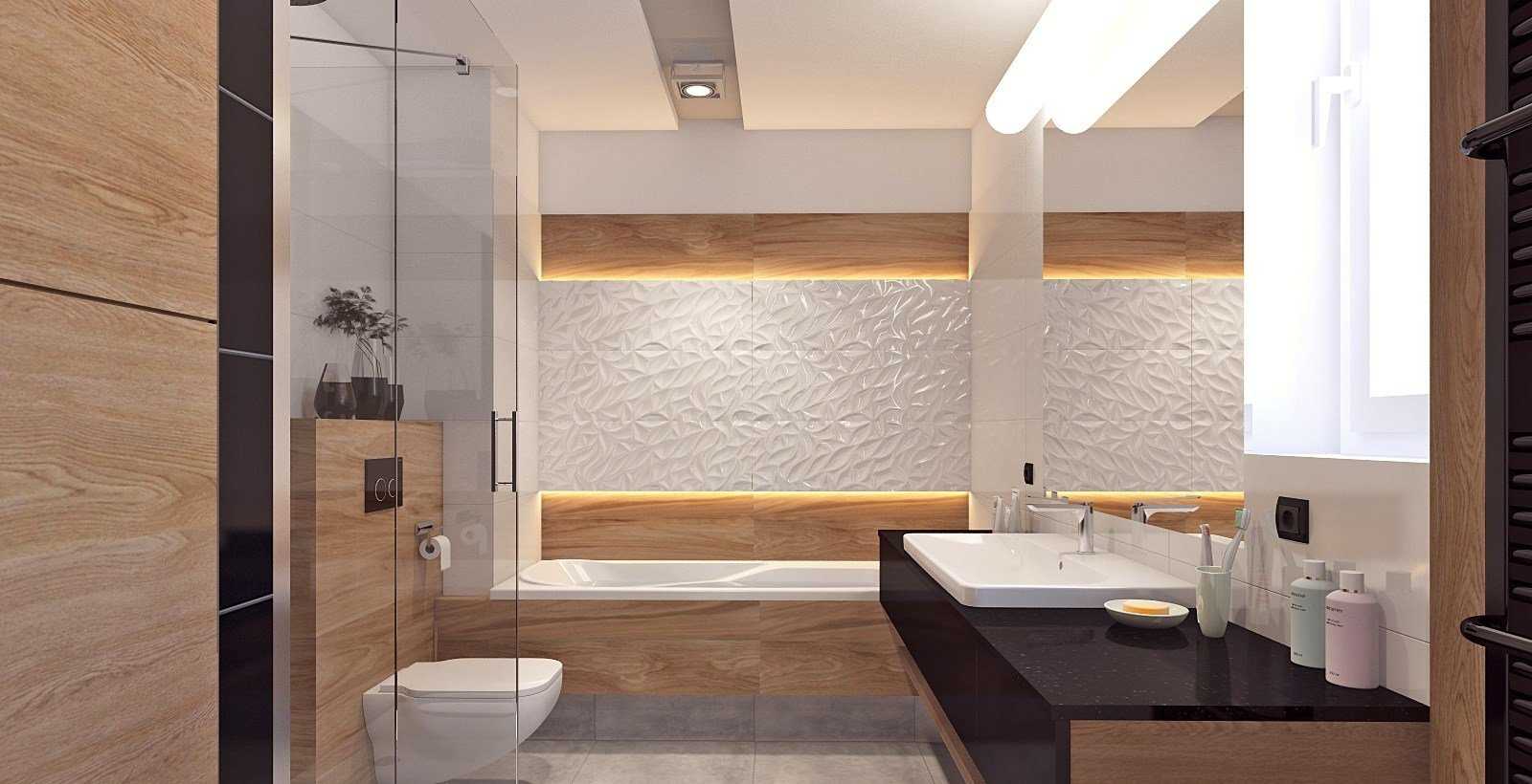- Освещение должно быть в достатке. Одна лампочка на стене — не вариант. Чтобы визуально увеличить пространство, желательно распределить свет равномерно. Для этого, можно установить в центральной части потолка плафон, который будет полноценно наполнять помещение светом. Кроме того, есть другой вариант посредством устройства декоративного потолка со встроенными светильниками. Точечные источники света разумно распределить в местах, наиболее необходимых для комфортного пребывания в ванной.