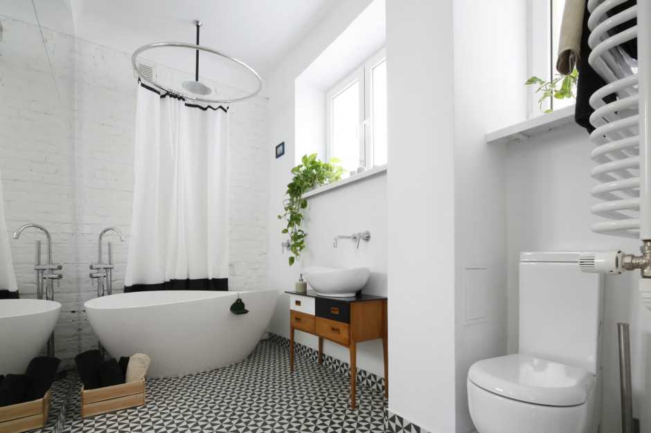 При выборе оборудования учитывайте размеры комнаты. К счастью, задача стала проще из-за производителей, которые вносят в предложение серию оборудования, идеально подходящее для всех ванных комнат. Для продажи доступны небольшие ванны, более короткие унитазы, угловые раковины и компактная мебель. Также стоит выбрать подвесное оборудование — унитаз и мебель. Подвесная сантехника выглядит компактнее, не занимает ценного места на полу, а также легче чистится. Кроме того, такая установка позволяет скрыть промывочный бочок и водопровод в стене.
