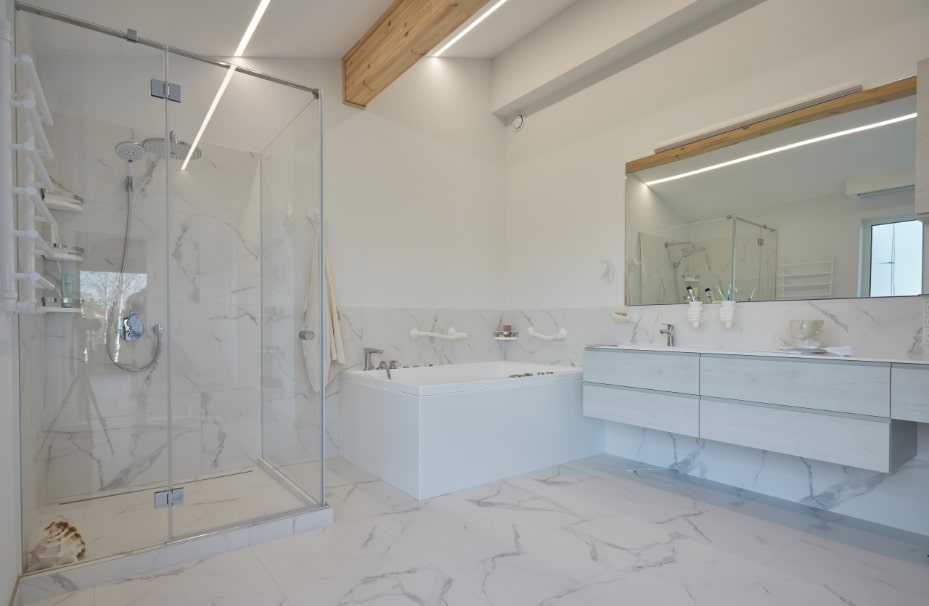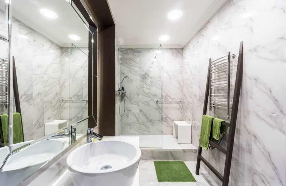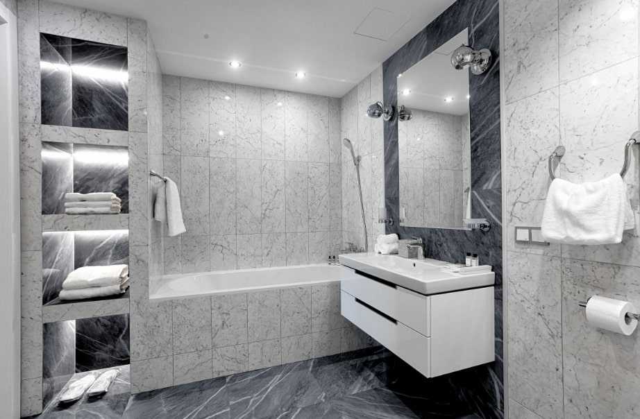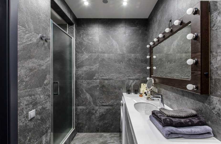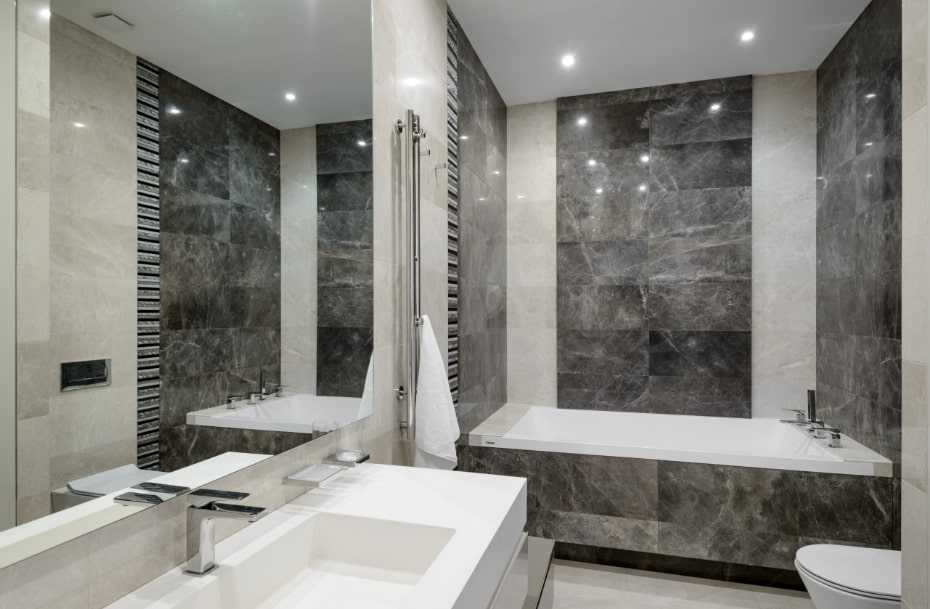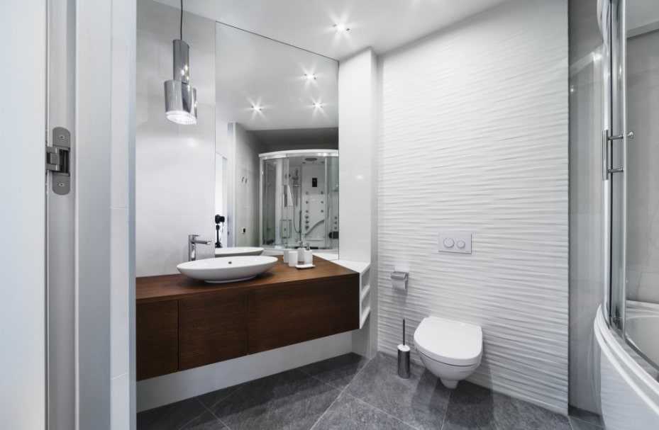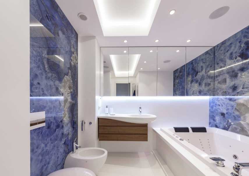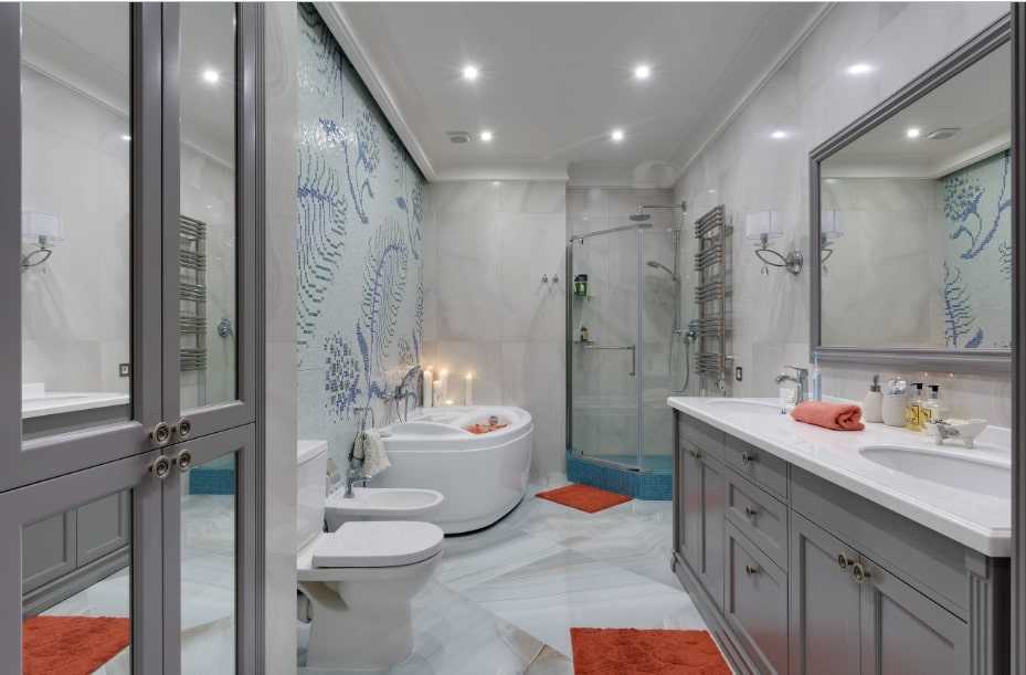 - большому помещению — солидное освещение, а значит, что чем больше ванная комната, тем более композиционно сложной и взвешенной должна быть система освещения (несколько уровней);