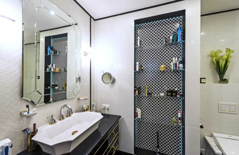 Ванная комната редко отличается большими габаритами, поэтому очень важно правильно использовать пространство. Обязательно стоит позаботиться о полочках или шкафчике для различных средств по уходу за телом и лицом