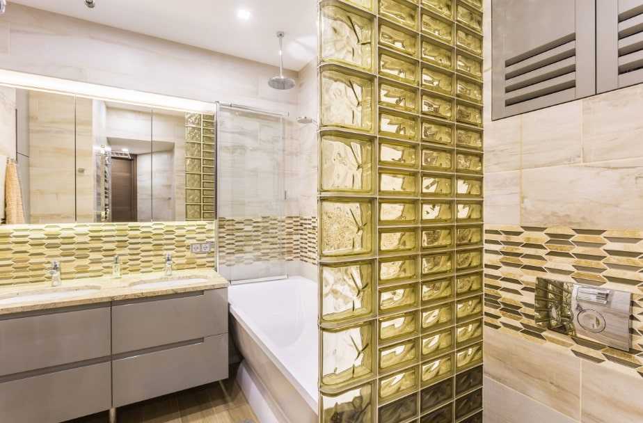 Стекло в маленькой ванной комнате – это риск получить травму. В просторной комнате шкаф со стеклянными дверцами чаще устанавливается.