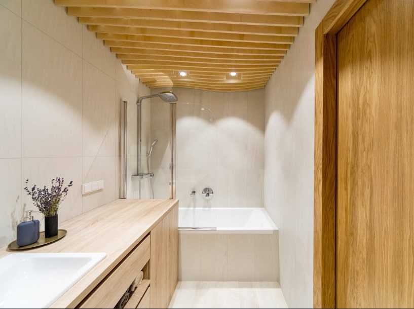 Если с оформлением стен часто возникают сложности, то с потолком все максимально просто. Белый однотонный потолок – лучшее решении для абсолютно любой ванной комнаты. Не стоит перегружать сложными конструкциями и без того небольшое пространство. При желании можно использовать навесные потолки, но они обязательно должны быть выполнены из влагостойкого материала. Это обеспечит более длительный срок его годности.