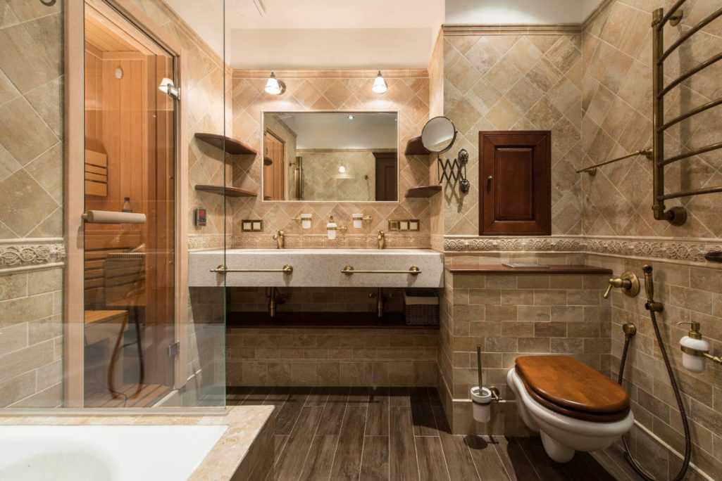 Грубость и простоту рустик подчеркнет натуральное дерево. В помещении, где расслабляет не только присутствие воды, но и множество древесных ароматов, особенно чувствуется близость естественной природы.