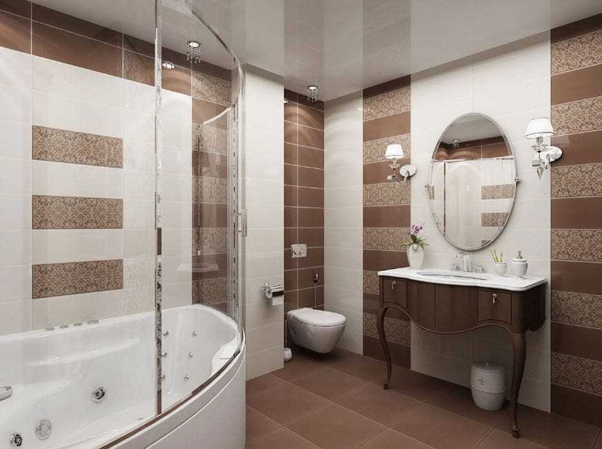 Ванная комната дизайн с фото модной плитки 2020, подходящей для маленькой ванны. В больших и просторных помещениях становится модным облицовка при помощи больших и крупных плиток, выполненных из натуральных камней или имитирующих их.